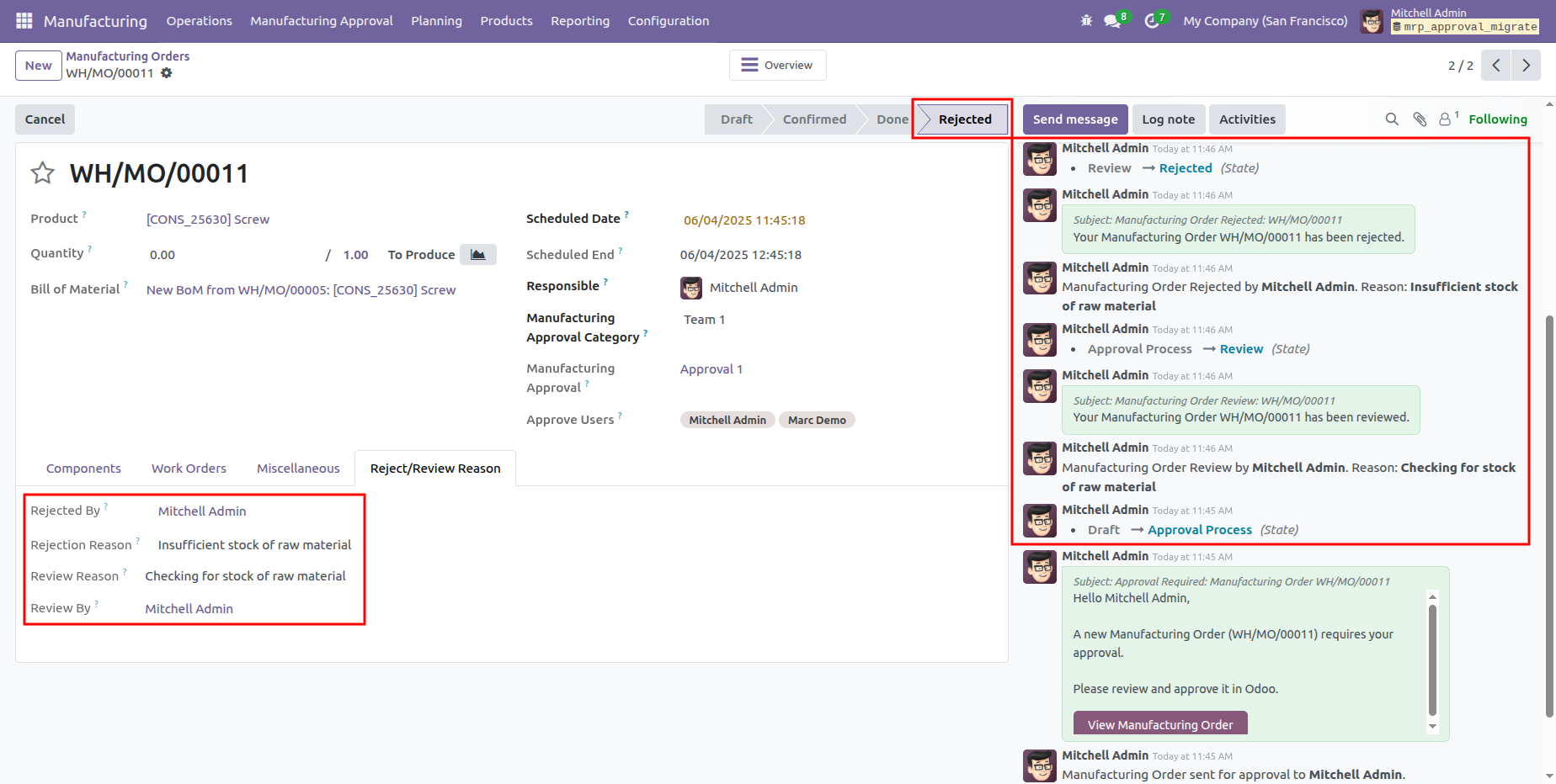 - Rejection : For declining and giving feedback on the Manufacturing order.